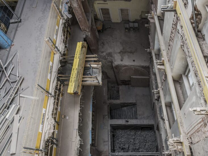 Für den Einbau der neuen, durchgehenden Stiegenhäuser waren weitreichende Rückbauarbeiten erforderlich. Die verbleibenden, freistehenden Außenwände mussten während des Bauzustands über eine Höhe von bis zu 25 Metern gesichert werden.